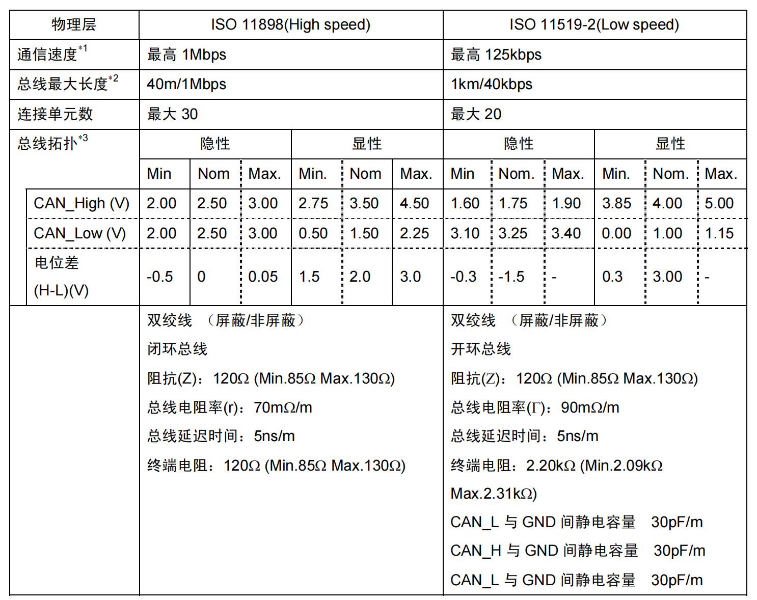 CAN总线由两根信号线组成,使用的是差分信号,是一种异步通讯CAN总线网络的结构有闭环和开环两种,其对应标准分别在**ISO11898(高速CAN标准)和ISO11519-2(低速CAN)**中描述(对OSI七层模型中的数据链路层和物理层进行了标准化),两种标准对比如下图所示:
