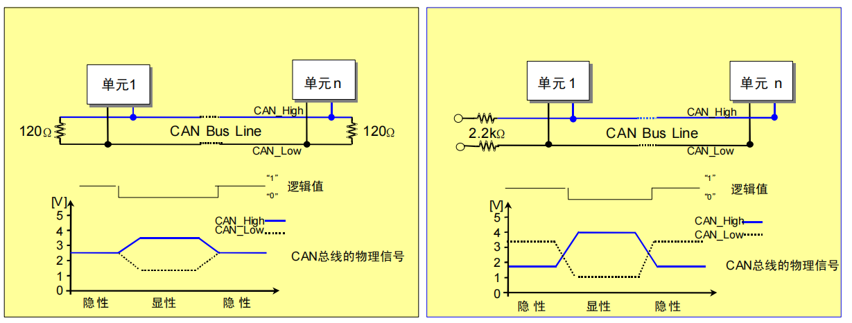 )两种,总线必须处于两种电平之一,总线上执行逻辑上的线与时,显性电平为0,隐形电平为1