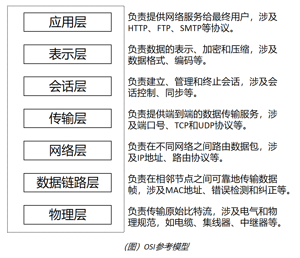 应用层 | 应用层 | HTTP, FTP, SMTP, DNS | 用户业务数据格式与交互规则 |