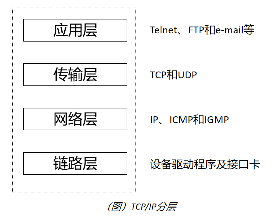网络协议通常分不同层次进行开发,每一层分别负责不同的通信功能。TCP/IP分层模型是互联网协议套件的基础,它简化了OSI模型,将网络通信过程划分为四个层次。TCP/IP模型的主要目的是提供一个实际可行的网络通信架构,它是互联网和许多其他网络的基础。TCP /IP,是一组不同层次上的多个协议的组合。 TCP/ IP通常被认为是一个四层协议系统,如下图所示。