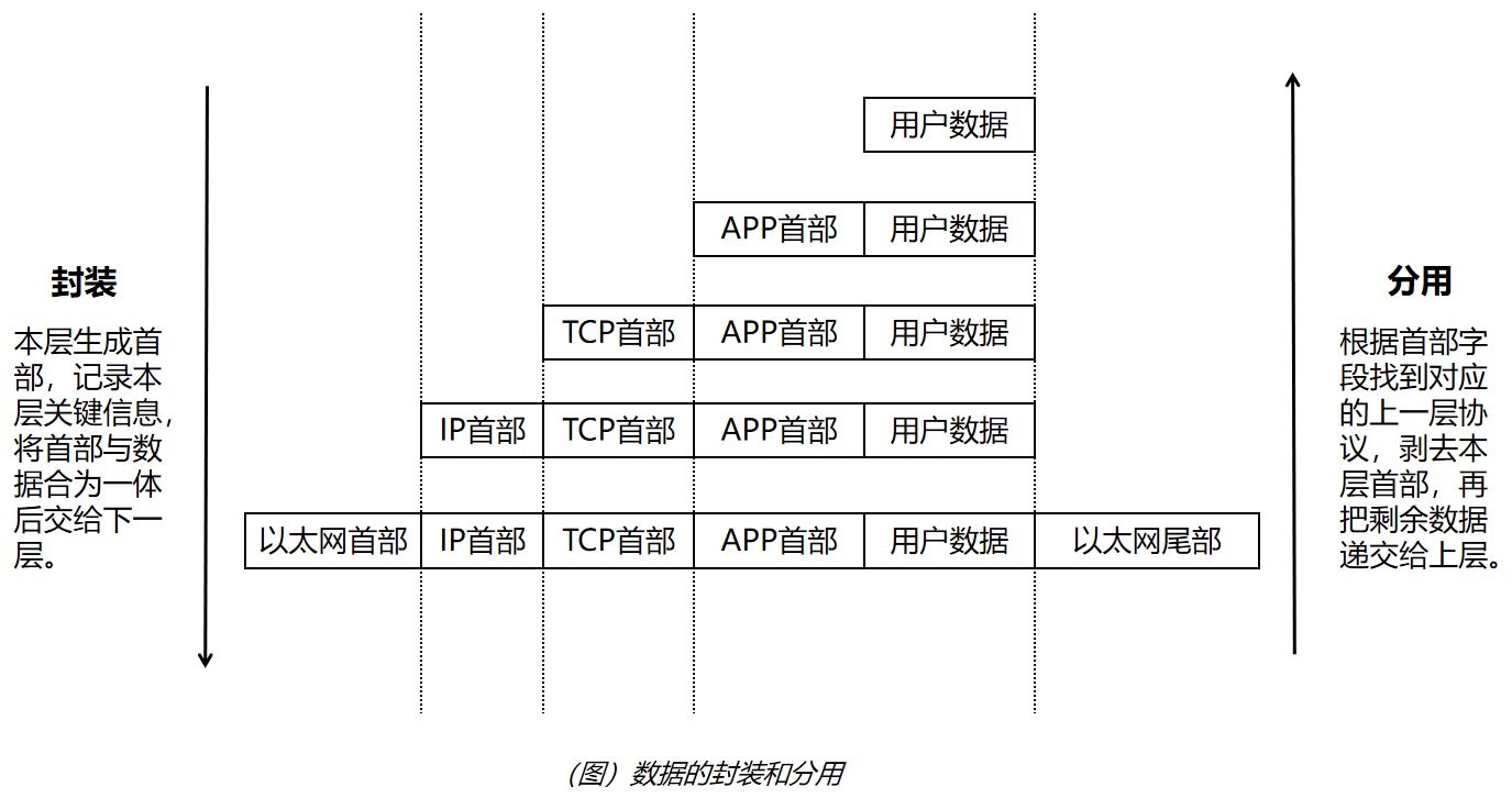 当应用程序用 TCP传送数据时,数据被送入协议栈中,然后逐个通过每一层直到被当作一串比特流送入网络。其中每一层对收到的数据都要增加一些首部信息(有时还要增加尾部信息),该过程叫做数据的封装。当目的主机收到一个以太网数据帧时,数据就开始从协议栈中由底向上升,同时去掉各层协议加上的报文首部。每层协议盒都要去检查报文首部中的协议标识,以确定接收数据的上层协议。这个过程称作数据的分用。过程如下所示。