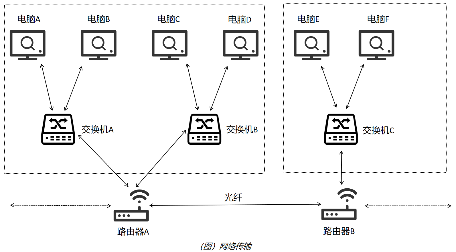 如(图)网络传输所示,若电脑A与电脑B通讯,数据传输步骤如下所示: